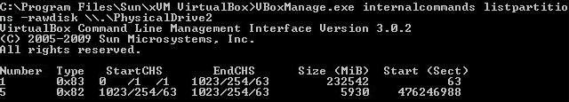 C:\Program Files\Sun\xVM VirtualBox>VBoxManage.exe internalcommands listpartitions -rawdisk \\.\PhysicalDrive2